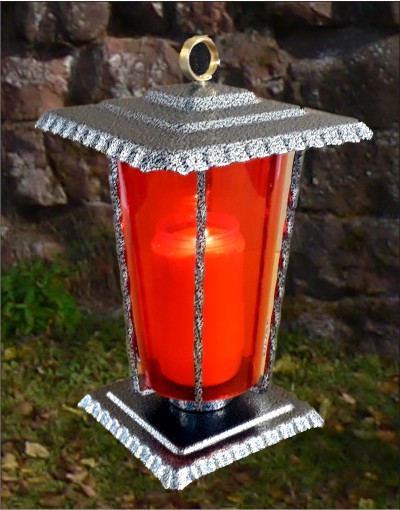 Silber antik. Für Grablichte bis 3 Tage Brenndauer. Stahlblech pulverbeschichtet, zum Aufklappen mit Kunststoffeinsatz. Abbildung mit 3-Tage Grablicht rot.